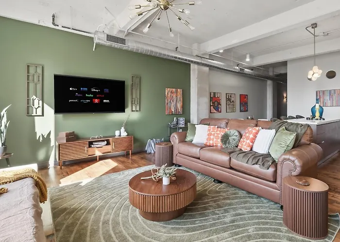 Featuring a private pool, the spacious Vintage Vibe Flat - Pool, Gym, Game & Movie Rm, Free Valet Apartment Dallas is a 6-minute walk from the Arena. Staying in this apartment, nestled in proximity to the large public park "Pioneer Plaza", guests can relax on a sun terrace.